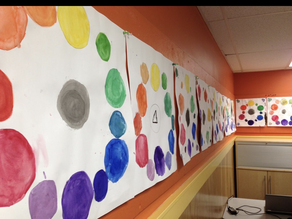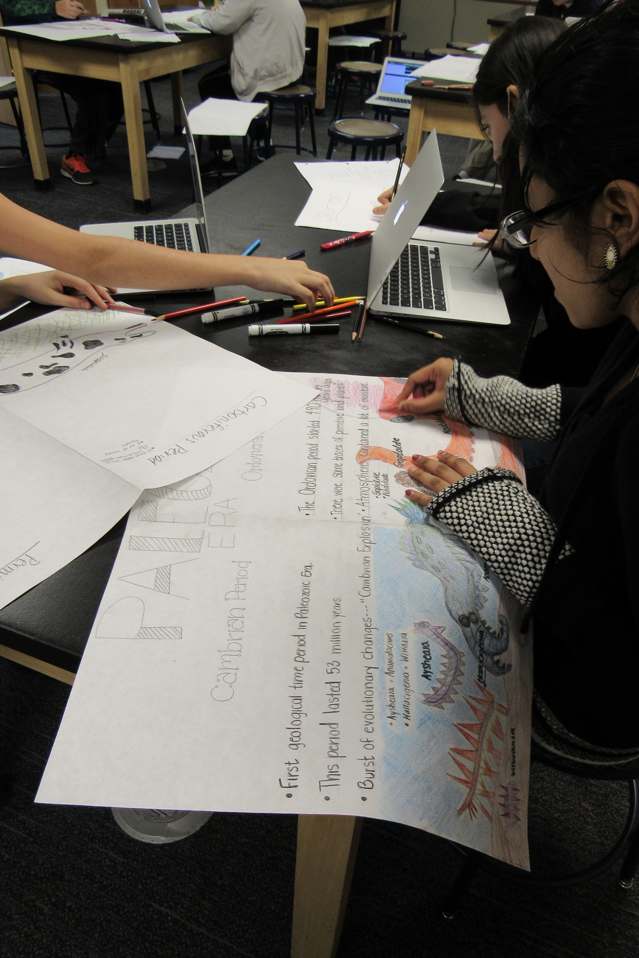 When studying the Timeline of Life on Earth, students have made prints of trilobites, drawings inspired by cells, spheres made of pottery clay, and tempera paintings of trees to show positive and negative space.