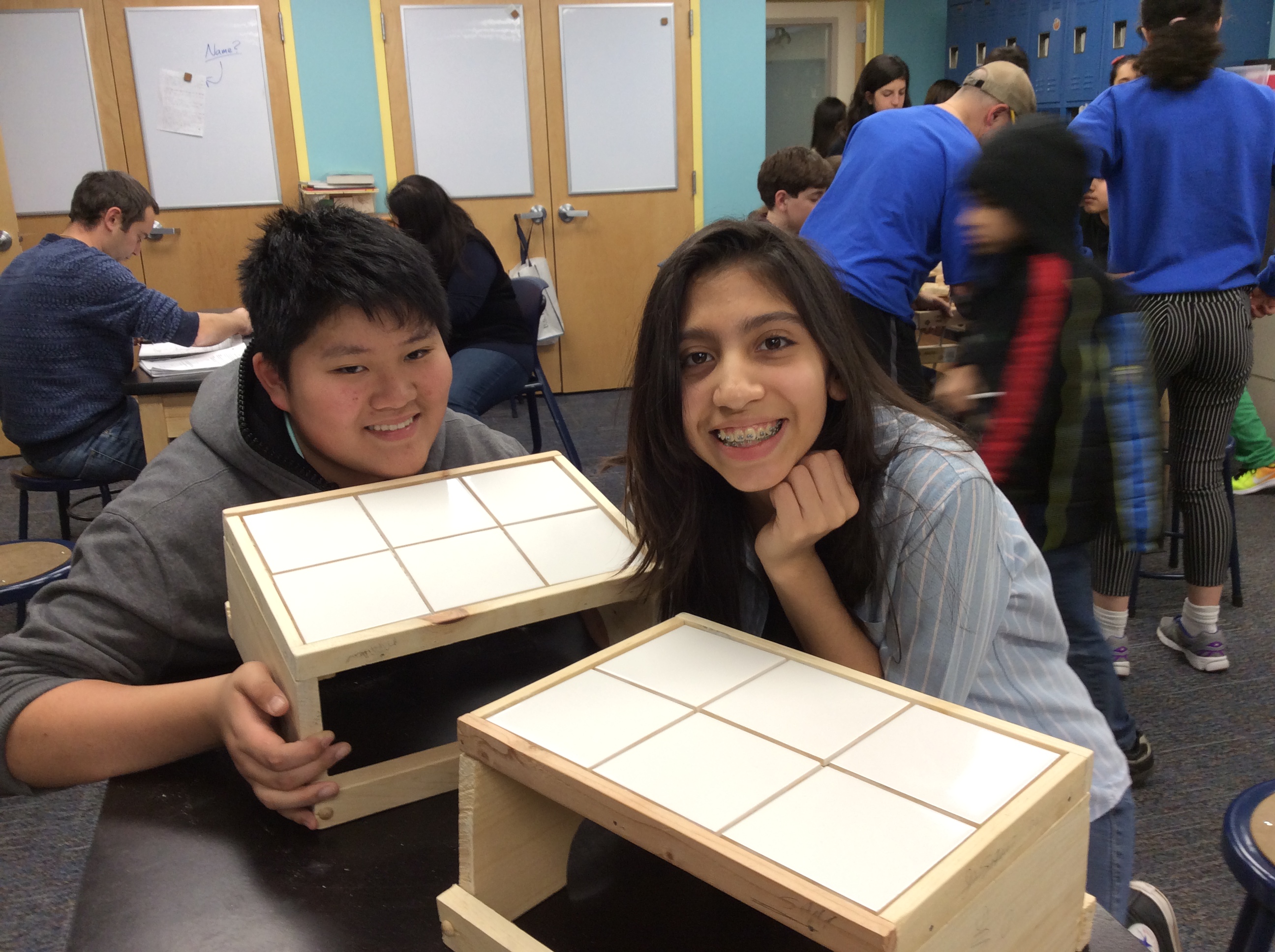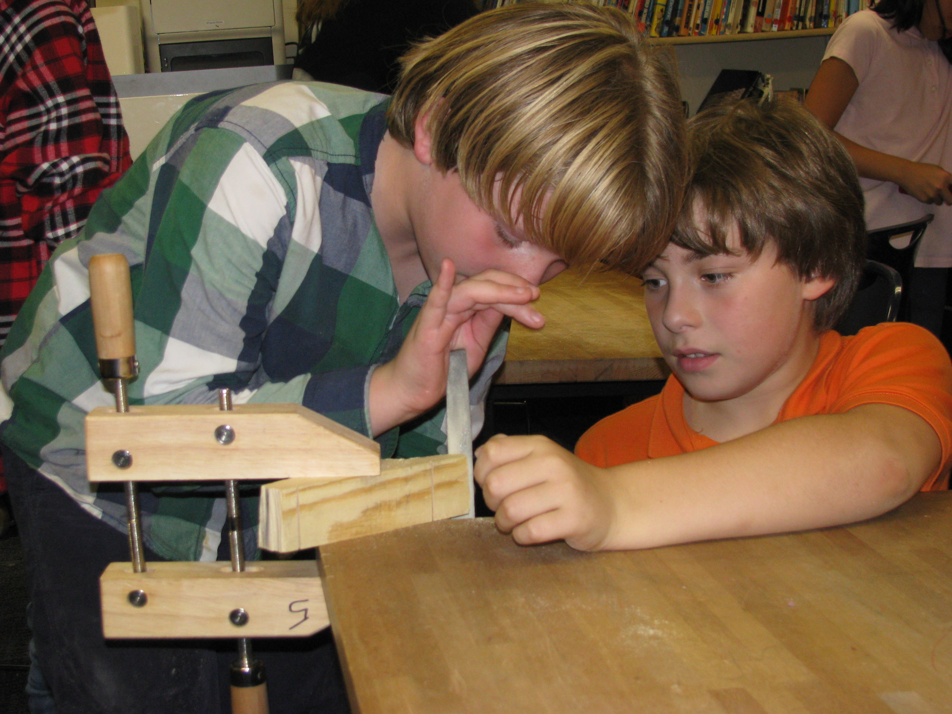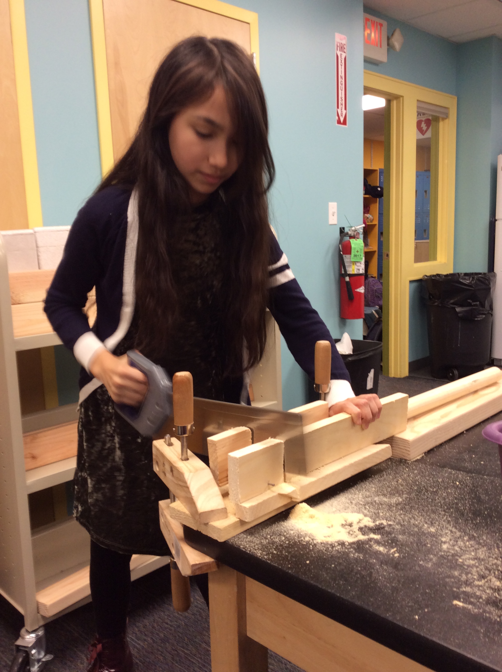 We make our own jigsaw puzzles using scaled down machine tools. We cut, sand, fasten and tile to make useful things like benches and coat racks. We learn to read architectural plans and to create scale drawings. We even wire our own lamps.